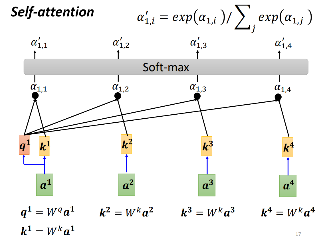 假设我们输入为a1,a2,a3,a4a^1,a^2,a^3,a^4,首先我们通过向量WqW^q乘以a1a^1得到q1q^1,也就是我们想得到a1a^1最后翻译得到的结果query,然后再通过向量WkW^k分别乘以a1,a2,a3,a4a^1,a^2,a^3,a^4得到k1,k2,k3,k4k^1,k^2,k^3,k^4,最后我们使用q1q^1分别乘以k2,k3,k4k^2,k^3,k^4得到α1,2,α1,3,α1,4\alpha_{1,2},\alpha_{1,3},\alpha_{1,4},再将其通过一个softmax层就得到了每个输入的注意力分数α1,i\alpha_{1,i}'