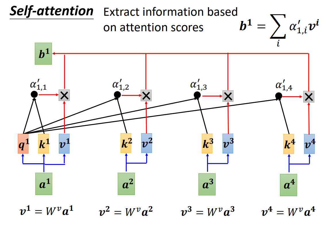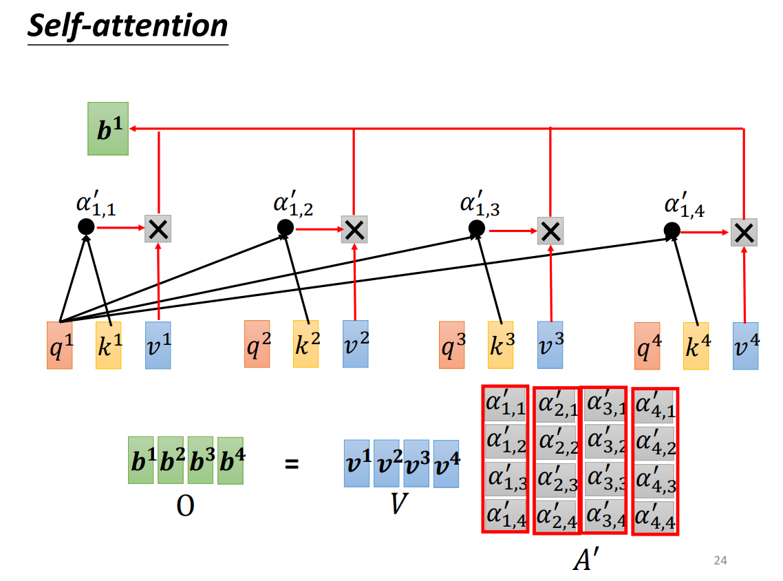 最后的输出b1=iα1,ivib^1 = \sum_i\alpha_{1,i}'v^i,其中vi=Wiaiv^i=W^ia_i。其余同理。