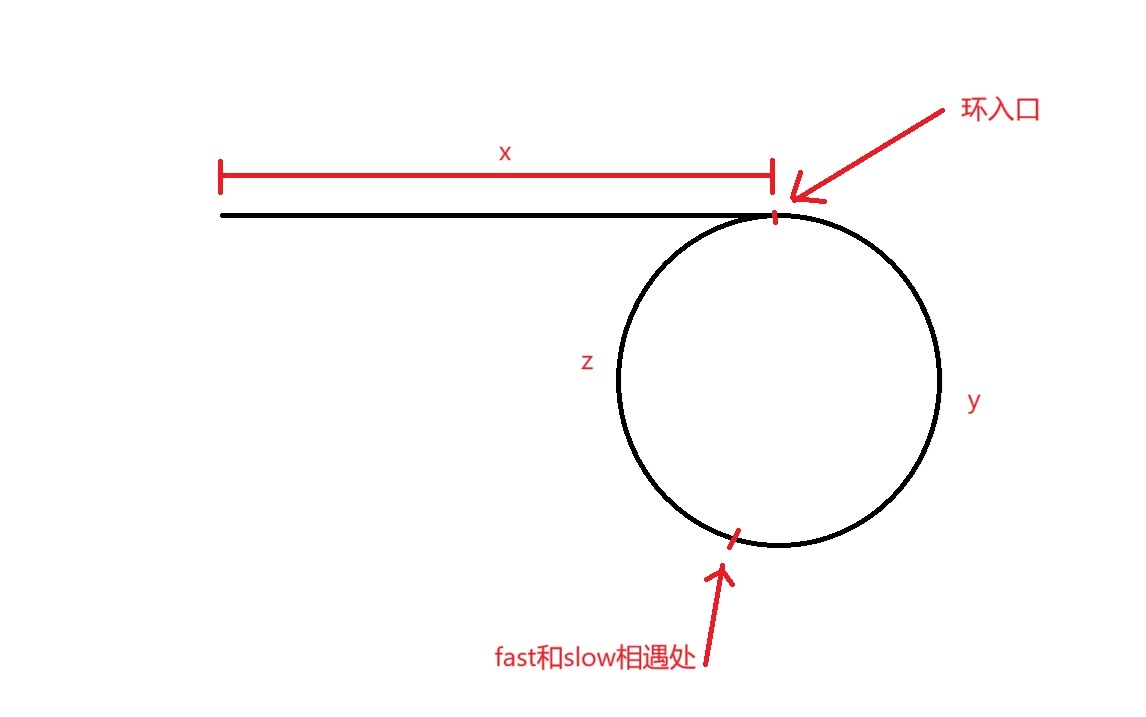 因为速度是的两倍,所以当走一圈时,一定走了两圈,它们一定会在其中相遇,也就是一定在在环内的第一圈中相遇,所以