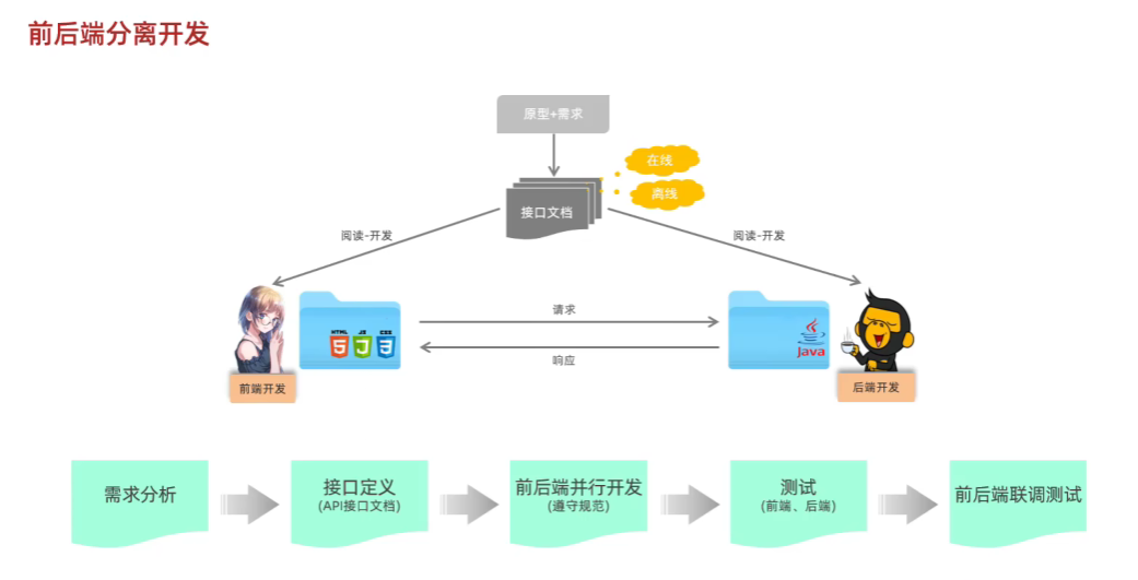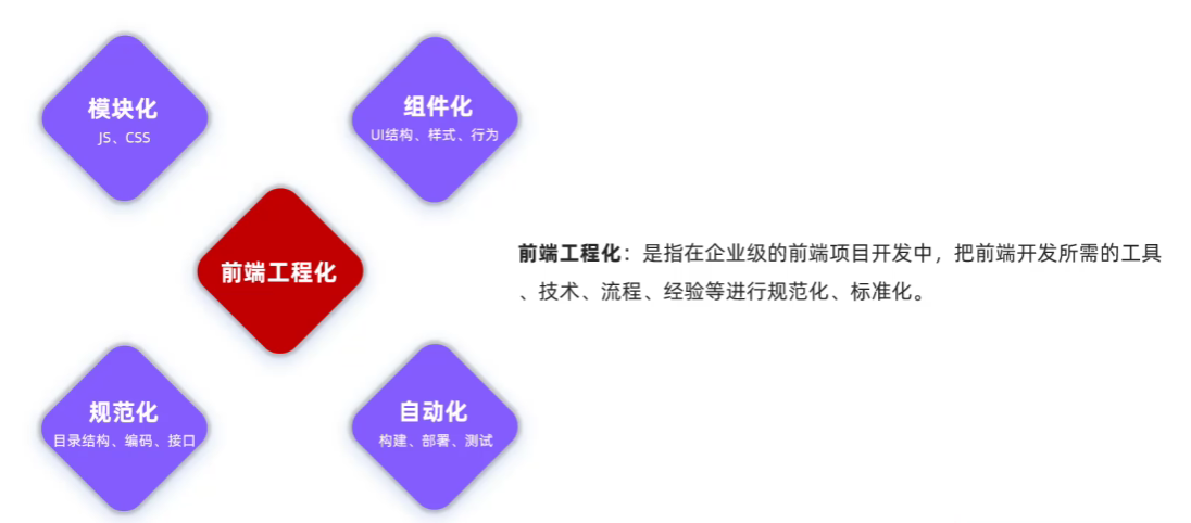 - 前端工程化是指在企业级的前端项目开发中,把前端开发所需的工具、技术、流程、经验等进行规范化、标准化