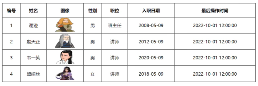 | <!DOCTYPE html> <html lang="en"> <head> <meta charset="UTF-8"> <meta http-equiv="X-UA-Compatible" content="IE=edge"> <meta name="viewport" content="width=device-width, initial-scale=1.0"> <title>Ajax-Axios-案例</title> <script src="js/axios-0.18.0.js"></script> <script src="js/vue.js"></script> </head> <body> <div id="app"> <table border="1" cellspacing="0" width="60%"> <tr> <th>编号</th> <th>姓名</th> <th>图像</th> <th>性别</th> <th>职位</th> <th>入职日期</th> <th>最后操作时间</th> </tr>