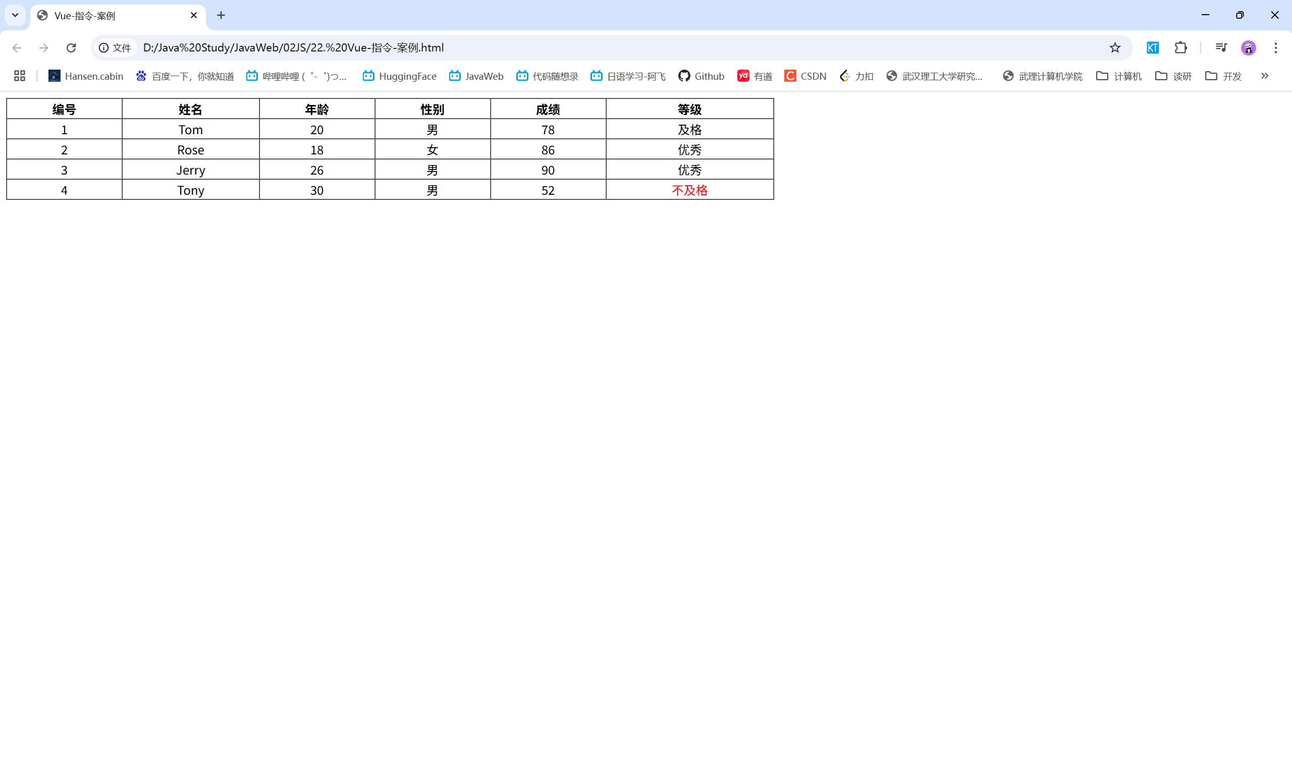 | <!DOCTYPE html> <html lang="en"> <head> <meta charset="UTF-8"> <meta http-equiv="X-UA-Compatible" content="IE=edge"> <meta name="viewport" content="width=device-width, initial-scale=1.0"> <title>Vue-指令-案例</title> <script src="js/vue.js"></script> </head> <body> <div id="app"> <table border="1" cellspacing="0" width="60%"> <tr> <th>编号</th> <th>姓名</th> <th>年龄</th> <th>性别</th> <th>成绩</th> <th>等级</th> </tr>