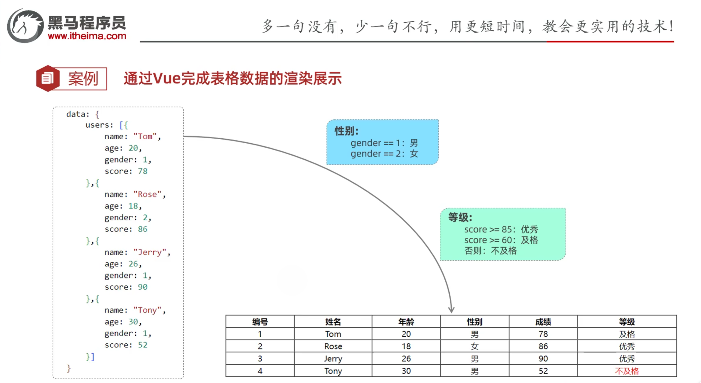 <tr align="center" v-for="(user, index) in users"> <td>{{index + 1}}</td> <td>{{user.name}}</td> <td>{{user.age}}</td> <td> <span v-if="user.gender == 1">男</span> <span v-if="user.gender == 2">女</span> </td> <td>{{user.score}}</td> <td> <span v-if="user.score >= 85">优秀</span> <span v-else-if="user.score >= 60">及格</span> <span style="color: red;" v-else>不及格</span> </td> </tr> </table>