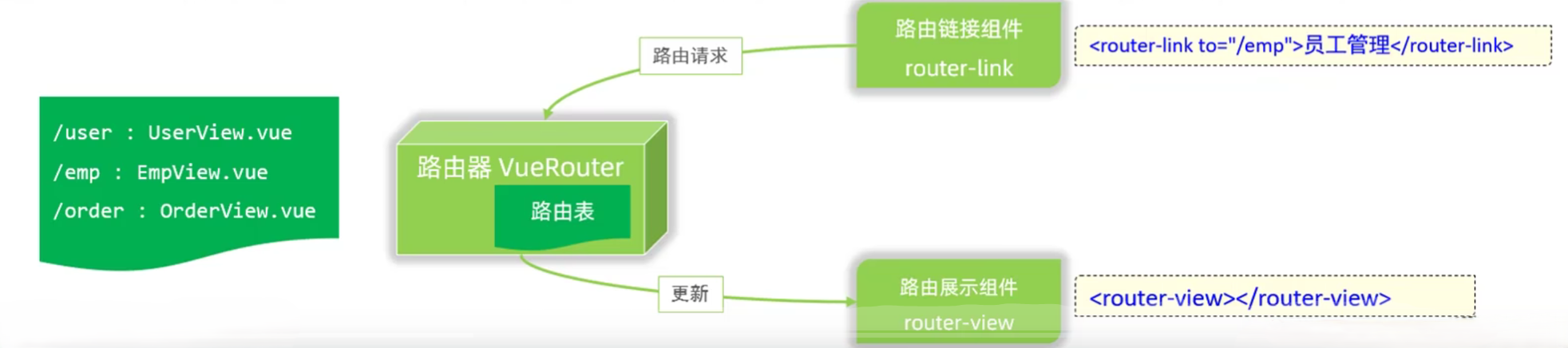 - VueRouter:路由器类,根据路由请求在路由视图中动态渲染选中的组件