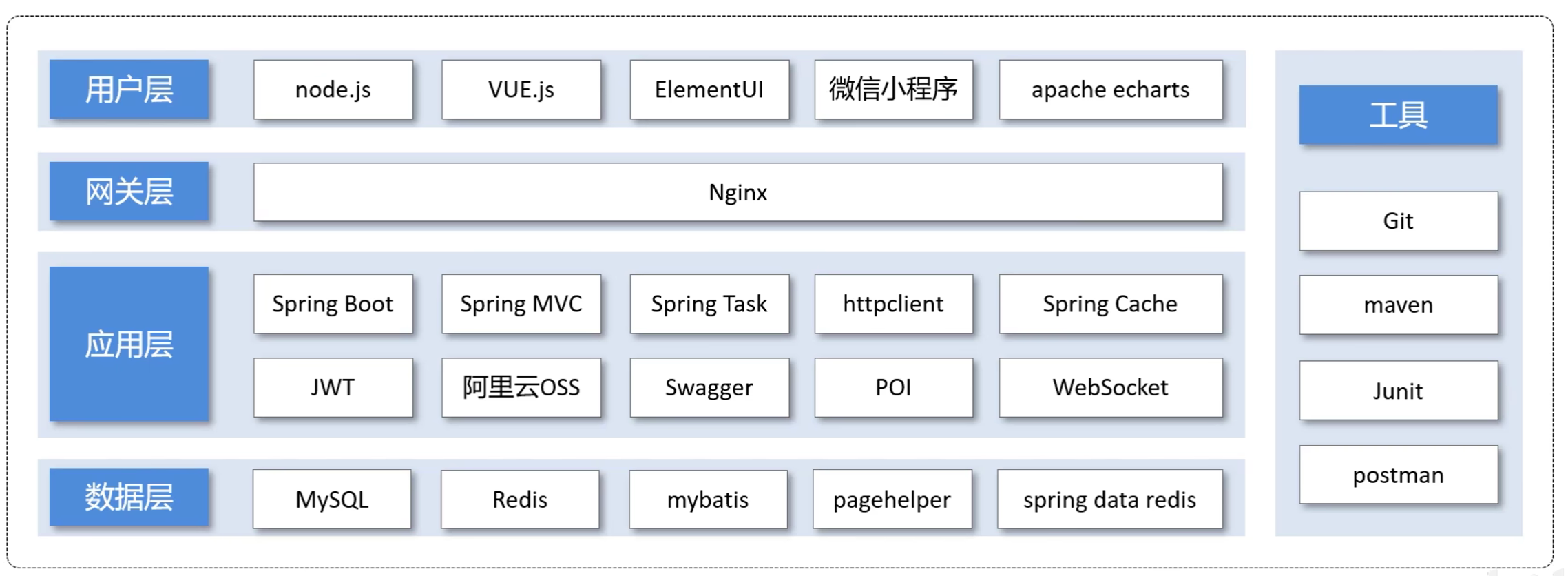 - 技术选型:展示了苍穹外卖中使用的技术框架和中间件等
