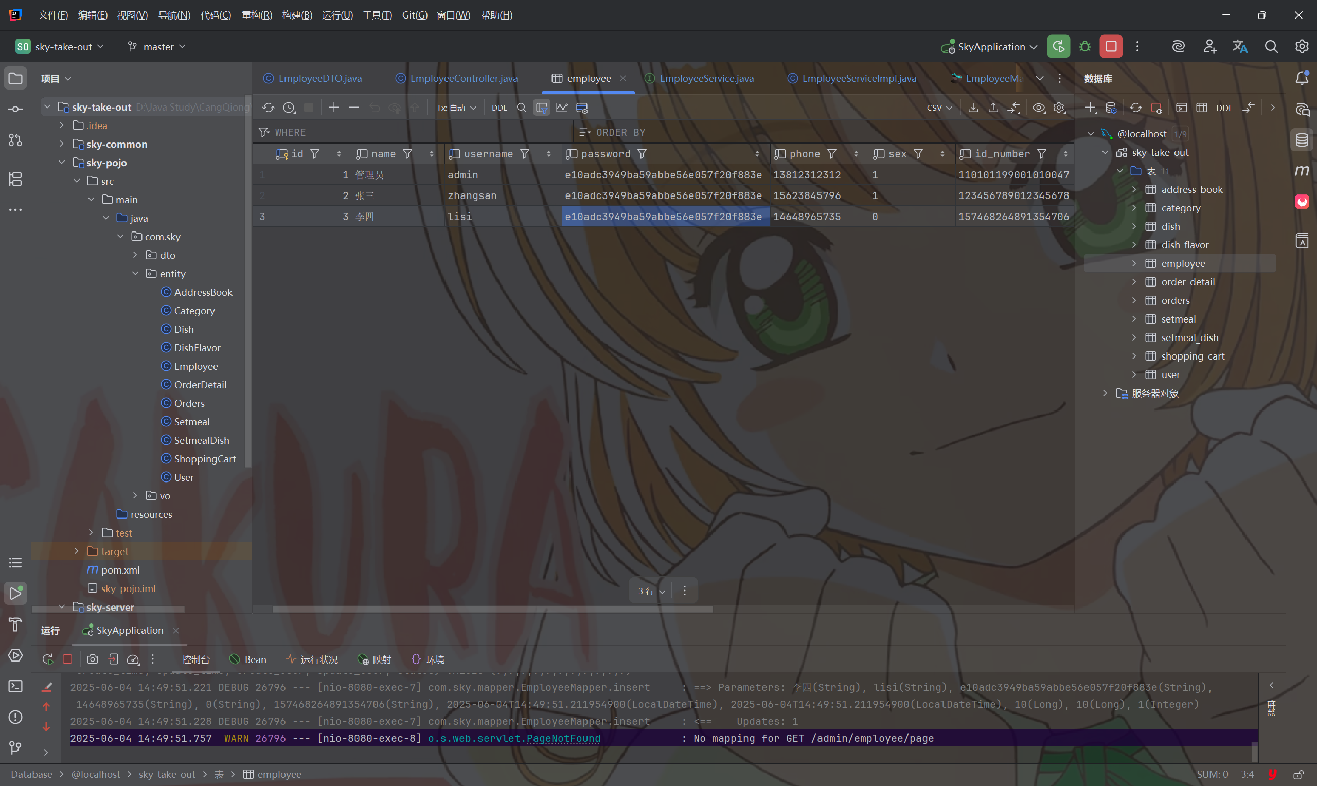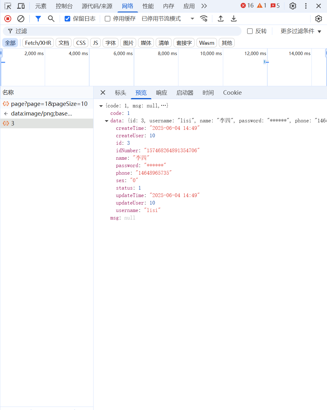 - 在查询员工信息时需要将密码设置为******,防止泄露用户隐私,设置之后前端接收到的数据就是: