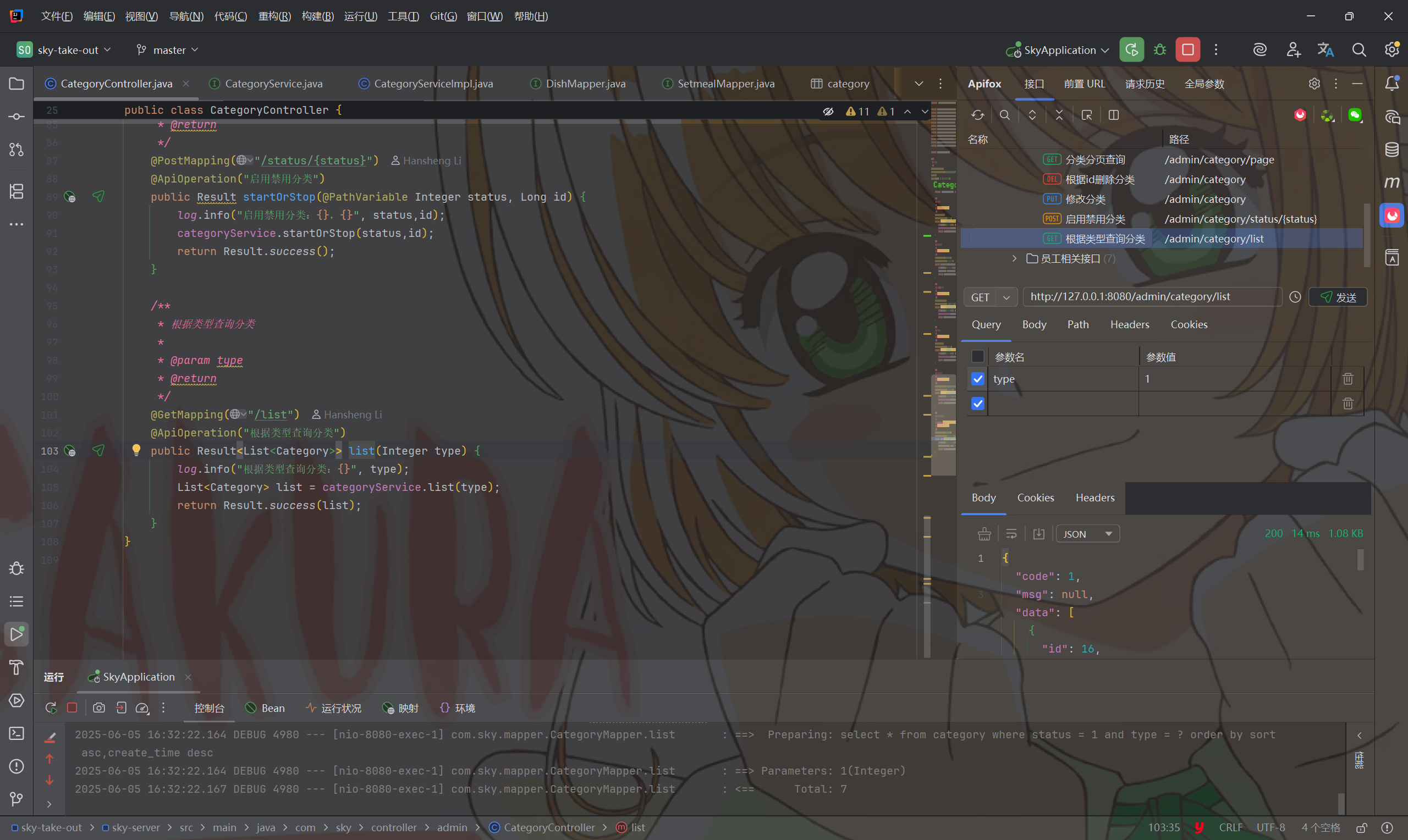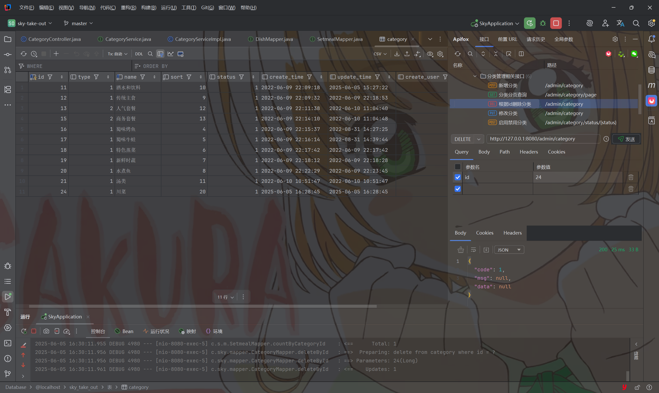 - 注意点:需要注意查询当前分类是否关联了菜品或套餐,如果关联了就抛出业务异常