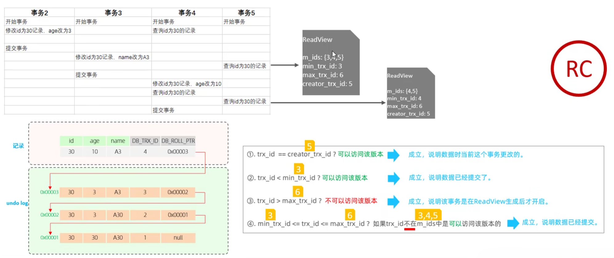 - RC隔离级别下,在事务中每一次执行快照读时生成ReadView。