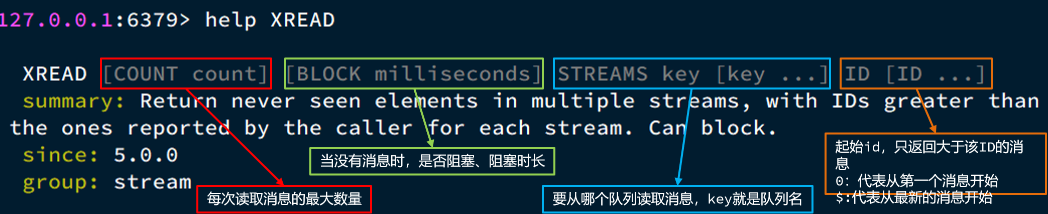- ID: 起始ID标示,$代表队列中最后一个消息,0则代表队列中的第一个消息