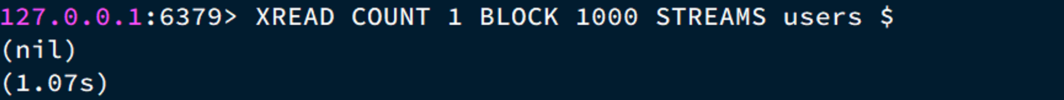Object msg = redis.execute("XREADGROUP GROUP g1 c1 COUNT 1 BLOCK 2000 STREAMS >");