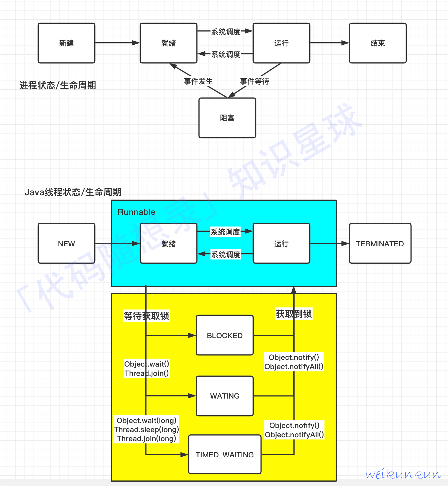 Ready和Running两个状态,在JVM层面,只能看到Runnable状态,这是因为现在的操作系统基本上都是使用“时间分片”方式进行抢占式轮转调度,而时间分片通常都很小,线程切换太快,区分这两种状态就没意义了